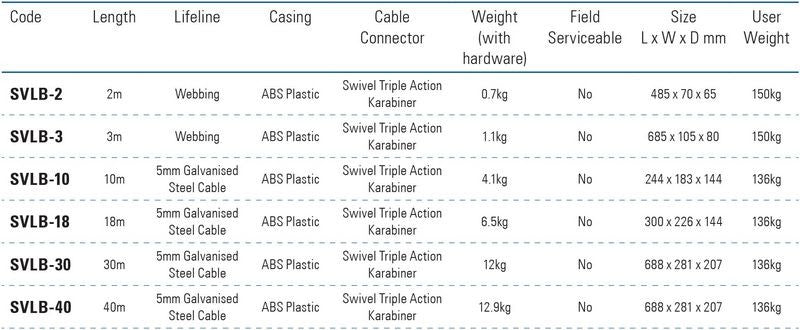 This ensures the device pays out freely but locks on rapidly to minimise free fall and impact loads on both the anchorage and the body. Their lightweight chassis, PC ABS housing and galvanised steel cable (webbing on the 2m and 3m) contribute to their outstanding strength and performance.